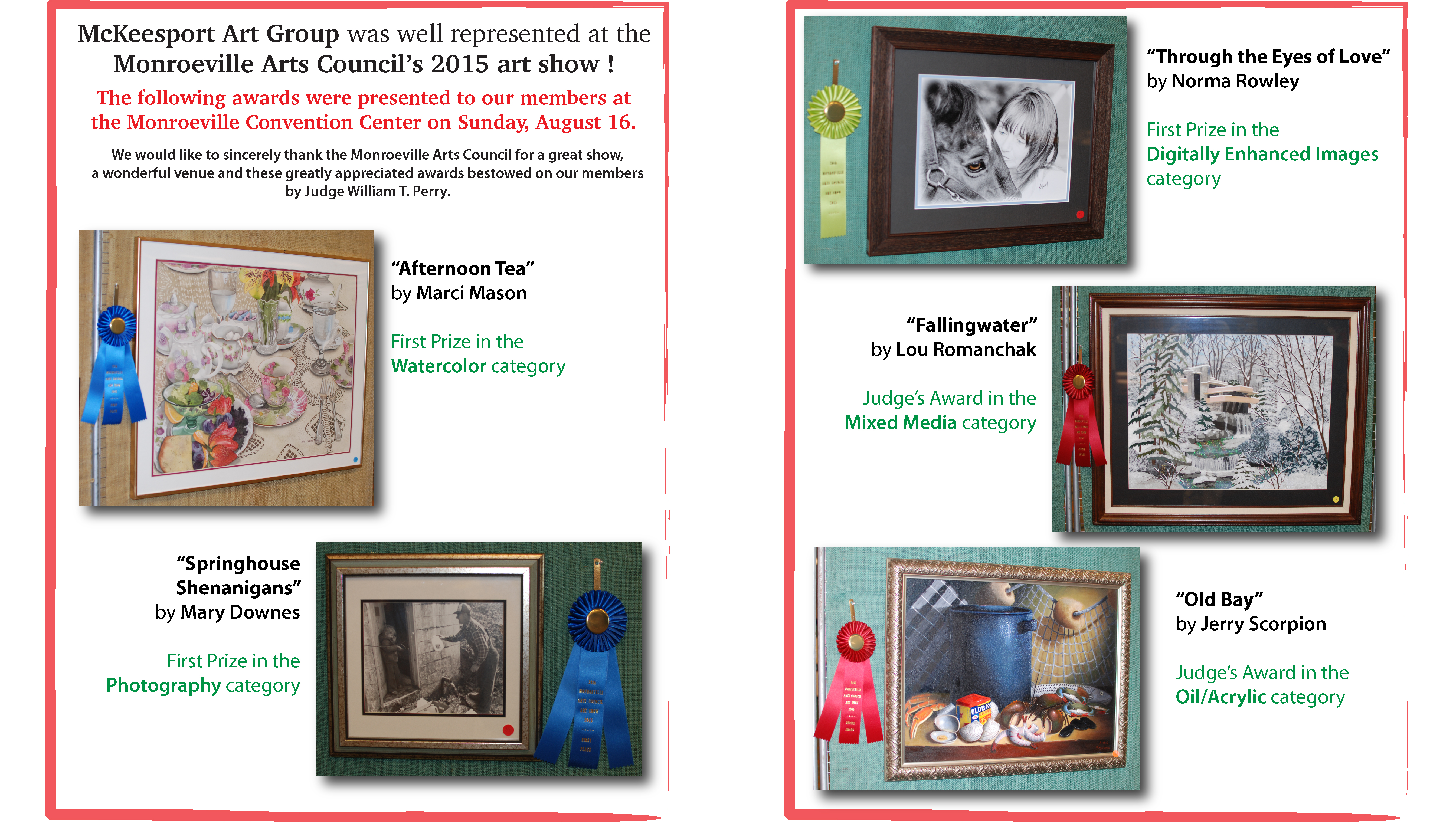 MAG members received honors at Monroeville Art Show Posted bymckartgroupAugust 25, 2015August 27, 2015Posted inUncategorized Share this: Click to share on X (Opens in new window) X Click to share on Facebook (Opens in new window) Facebook Like Loading... Related