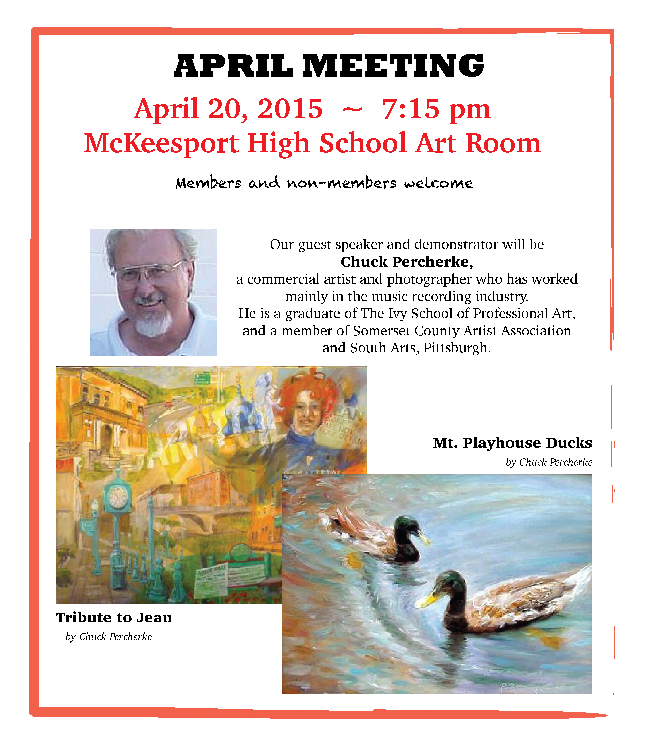 Come join us on Tuesday, February 18, 2014 at 7:30 p.m. in the Art Room at McKeesport Area High School. All are welcome; you do not have to be a member to attend. Our guest will be Elayne Eckman, Caricature Artist.