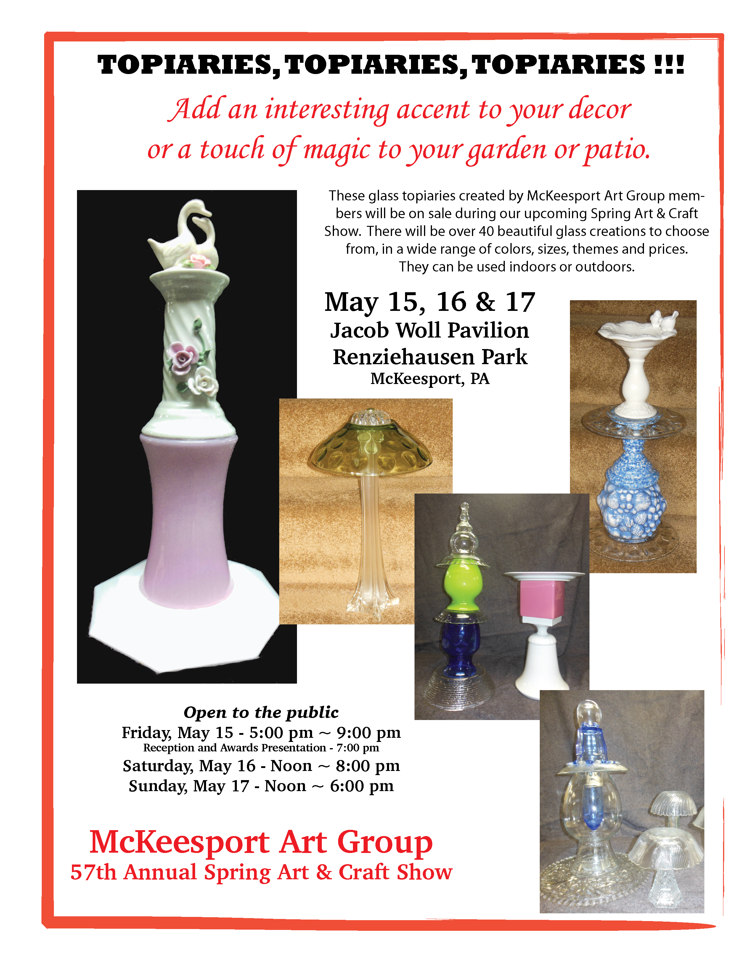 The 56th annual McKeesport spring art show and sale will be held Friday, May 16, Saturday, May 17, and Sunday, May 18, in Renziehausen Park at Jacob Woll Pavilion, McKeesport.