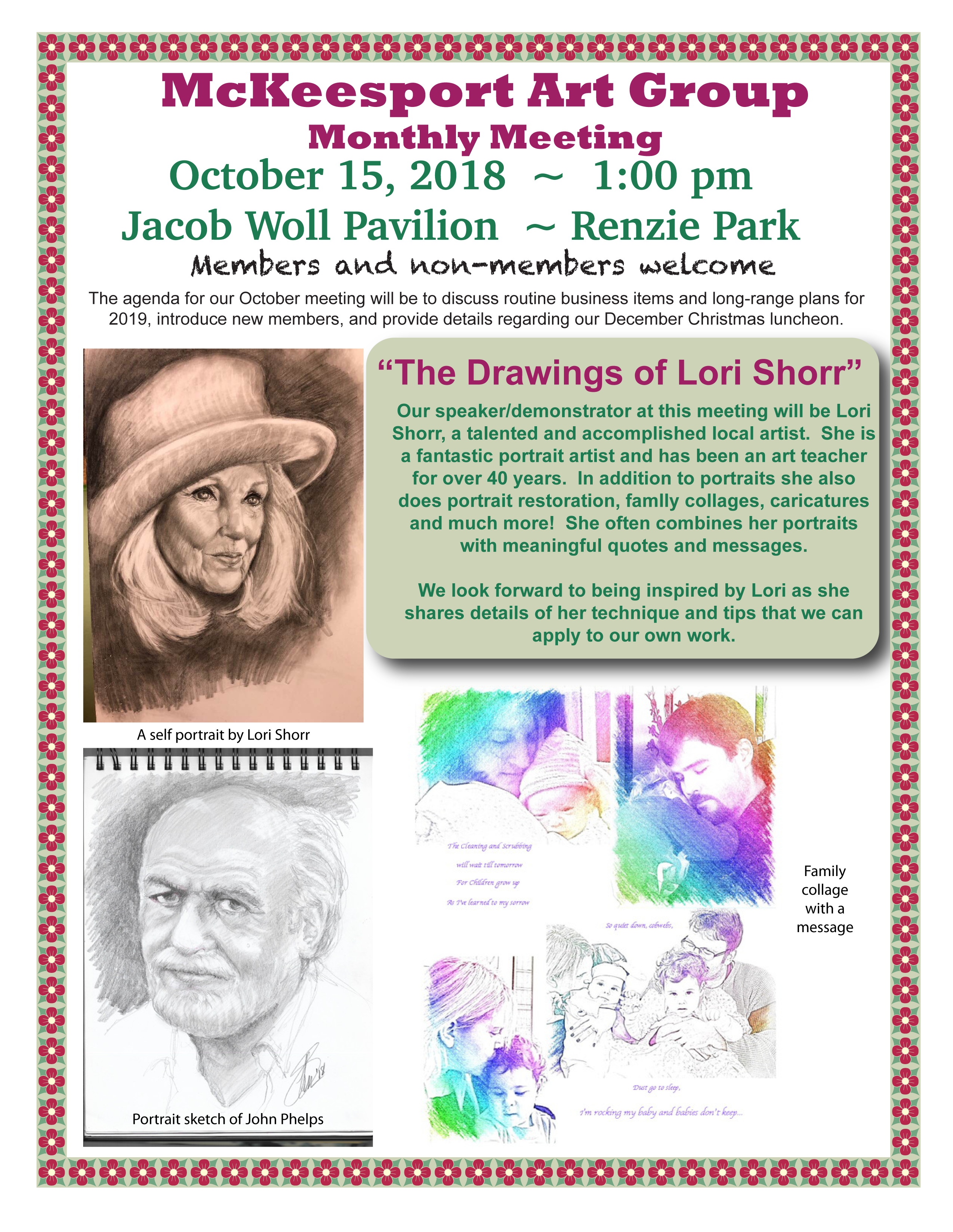 The McKeesport Art Group wishes everyone a joyous holiday season, and a happy, healthy and prosperous 2019. We look forward to seeing members, as well as non-members, prospective members and guests, at our first meeting of the new year in February – a schedule of our 2019 meetings will be published in January.